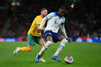 LONDON, ENGLAND – OCTOBER 13: Fikayo Tomori of England is challenged by Martin Boyle of Australia during the international friendly match between England and Australia at Wembley Stadium on October 13, 2023 in London, England. (Photo by Justin Setterfield/Getty Images)