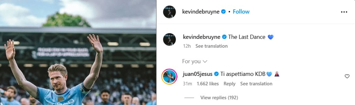 Just a few minutes ago, Napoli defender Juan Jesus commented on De Bruyne’s latest Instagram post, telling the Belgian midfielder that the Partenopei are “waiting for him.”
