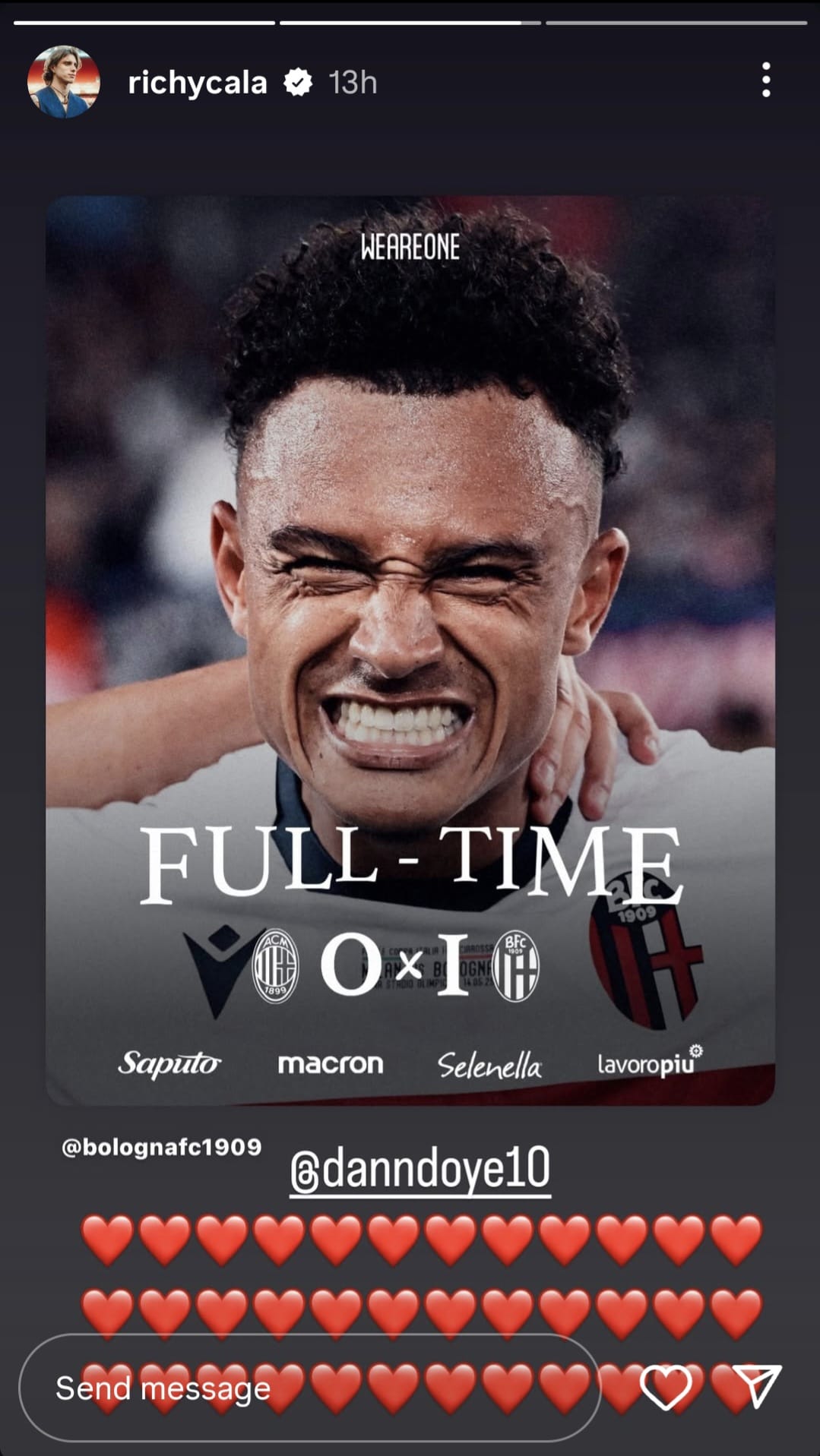 Calafiori sent a message of congratulations to goalscorer Ndoye, while Zirkzee wrote ‘Forza Bologna’ along with a pair of pictures during and after the game.